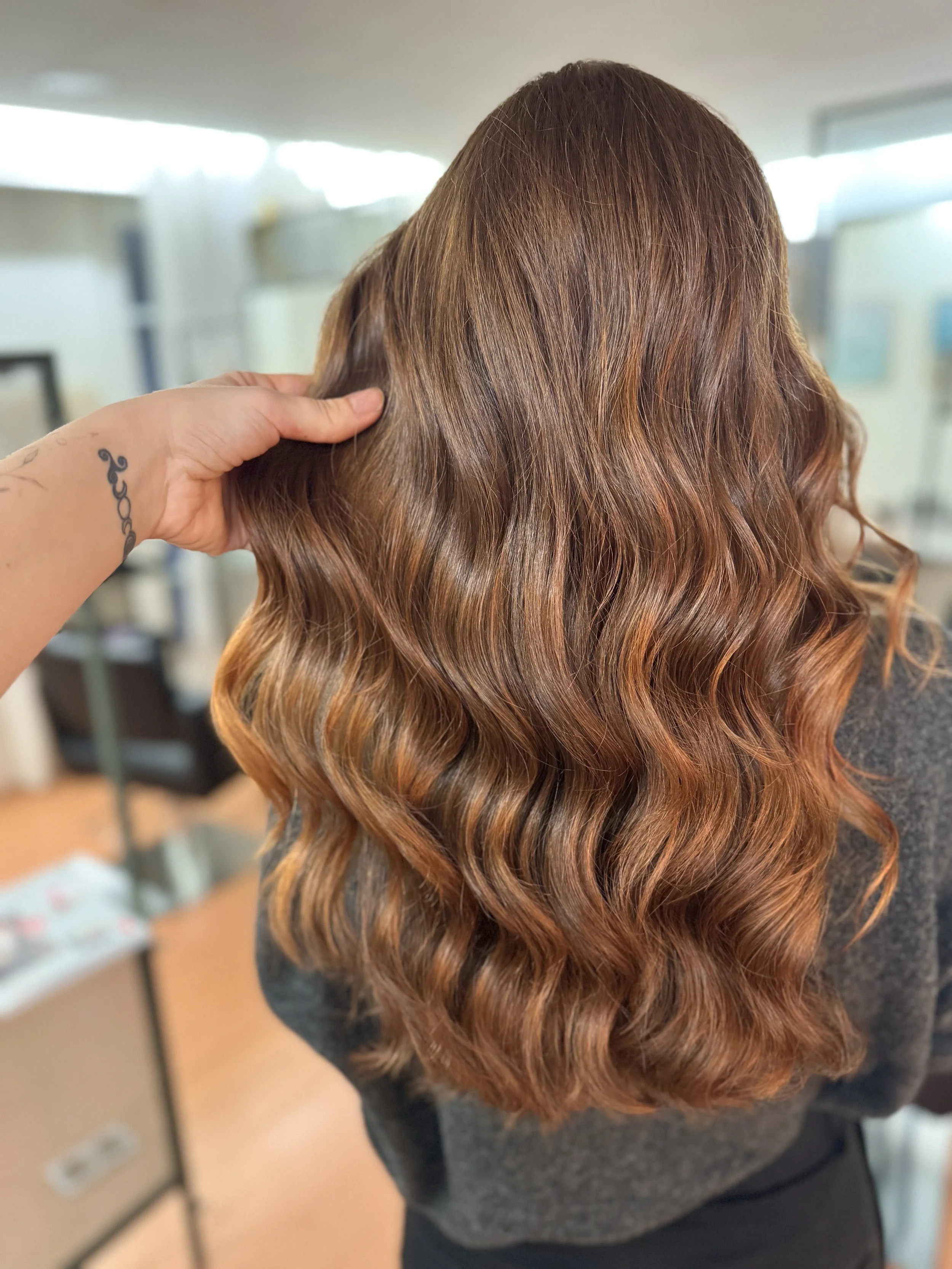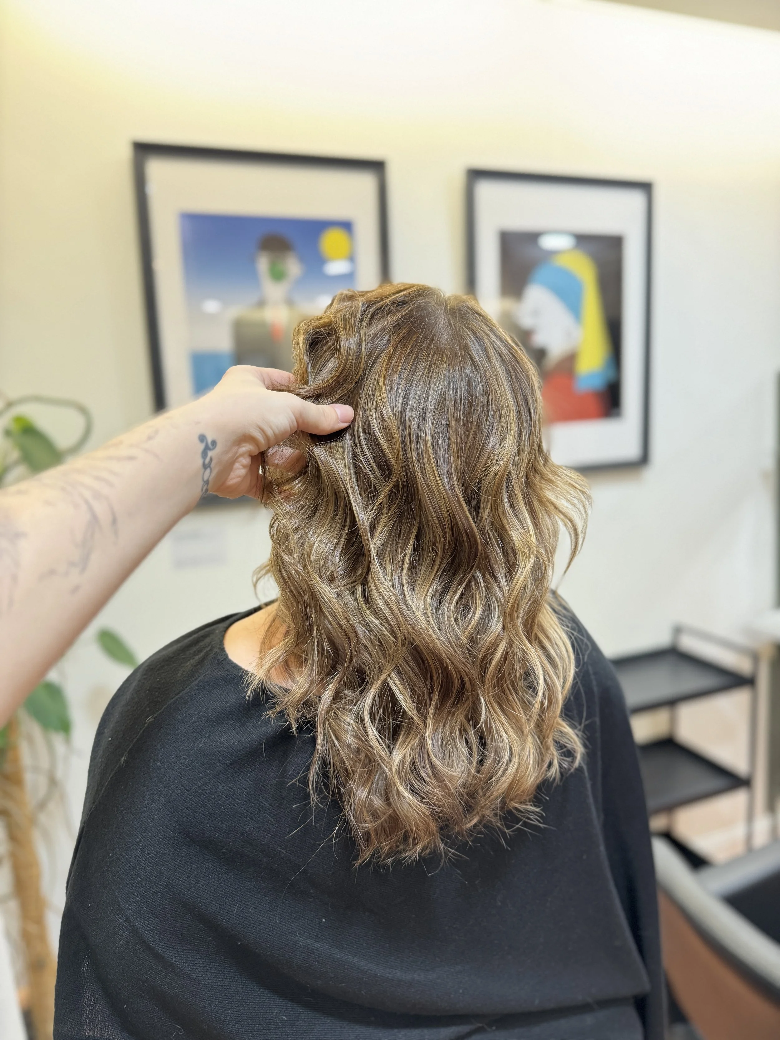 C’est un balayage partiel, suivit d’une patine pour neutraliser et apporter des reflets doux et harmonieux.